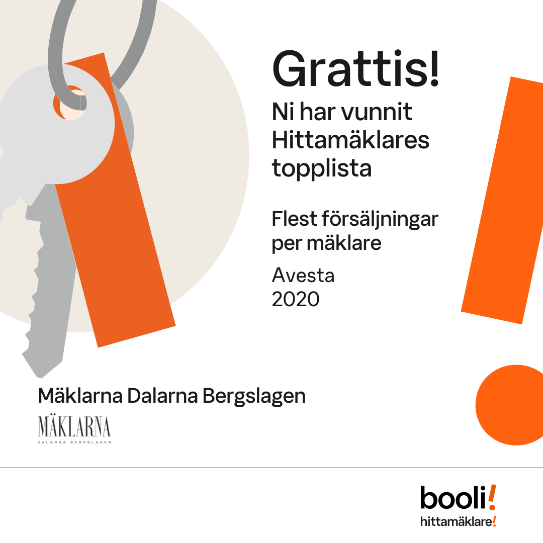 Statistik för publicerade bostäder, försäljningar och omdömen baseras på data från Booli och Hittamäklare. Statistiken för försäljningar avser inrapporterade och verifierade slutpriser från mäklare eller av Booli inhämtade och verifierade slutpriser. Statistiken för publicerade bostäder baseras på information som publicerats på Booli.se. Statistik för omdömen och rekommendationer baseras på omdömen från säljare som lämnats via Booli och Hittamäklare.