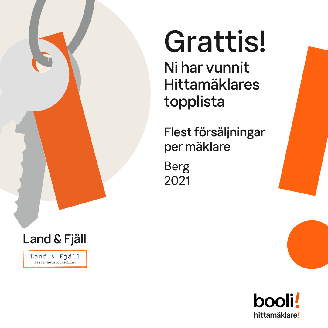 Statistik för publicerade bostäder, försäljningar och omdömen baseras på data från Booli och Hittamäklare. Statistiken för försäljningar avser inrapporterade och verifierade slutpriser från mäklare eller av Booli inhämtade och verifierade slutpriser. Statistiken för publicerade bostäder baseras på information som publicerats på Booli.se. Statistik för omdömen och rekommendationer baseras på omdömen från säljare som lämnats via Booli och Hittamäklare.