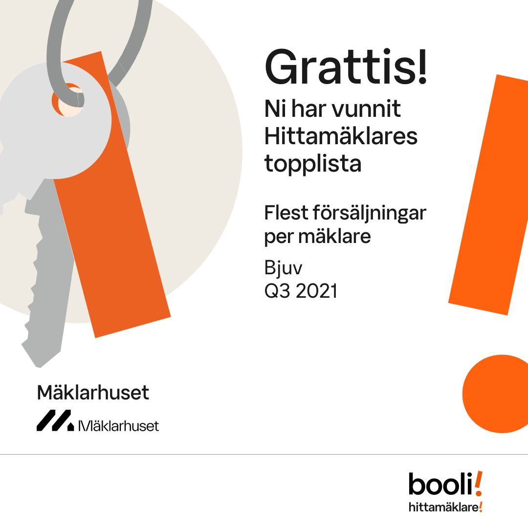 Statistik för publicerade bostäder, försäljningar och omdömen baseras på data från Booli och Hittamäklare. Statistiken för försäljningar avser inrapporterade och verifierade slutpriser från mäklare eller av Booli inhämtade och verifierade slutpriser. Statistiken för publicerade bostäder baseras på information som publicerats på Booli.se. Statistik för omdömen och rekommendationer baseras på omdömen från säljare som lämnats via Booli och Hittamäklare.