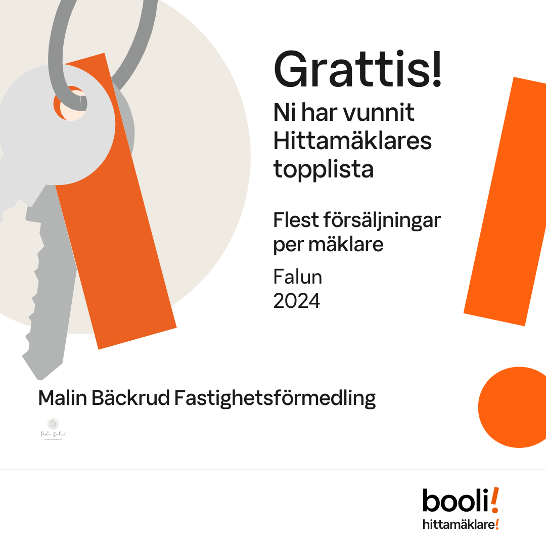 Statistik för publicerade bostäder, försäljningar och omdömen baseras på data från Booli och Hittamäklare. Statistiken för försäljningar avser inrapporterade och verifierade slutpriser från mäklare eller av Booli inhämtade och verifierade slutpriser. Statistiken för publicerade bostäder baseras på information som publicerats på Booli.se. Statistik för omdömen och rekommendationer baseras på omdömen från säljare som lämnats via Booli och Hittamäklare.