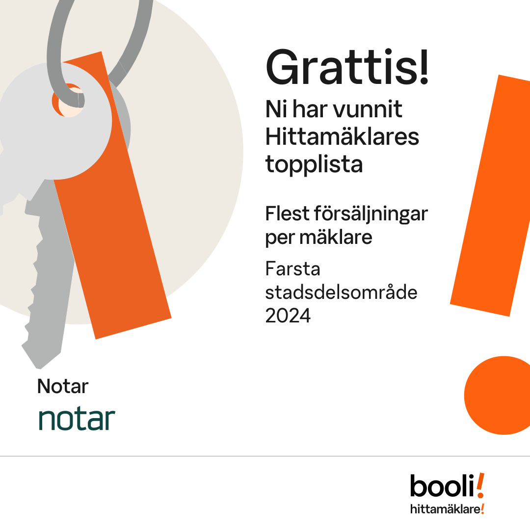 Statistik för publicerade bostäder, försäljningar och omdömen baseras på data från Booli och Hittamäklare. Statistiken för försäljningar avser inrapporterade och verifierade slutpriser från mäklare eller av Booli inhämtade och verifierade slutpriser. Statistiken för publicerade bostäder baseras på information som publicerats på Booli.se. Statistik för omdömen och rekommendationer baseras på omdömen från säljare som lämnats via Booli och Hittamäklare.