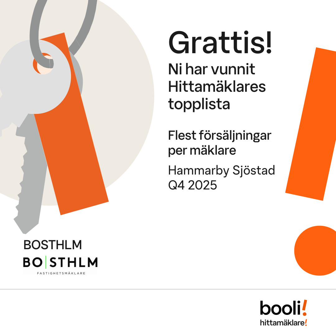 Statistik för publicerade bostäder, försäljningar och omdömen baseras på data från Booli och Hittamäklare. Statistiken för försäljningar avser inrapporterade och verifierade slutpriser från mäklare eller av Booli inhämtade och verifierade slutpriser. Statistiken för publicerade bostäder baseras på information som publicerats på Booli.se. Statistik för omdömen och rekommendationer baseras på omdömen från säljare som lämnats via Booli och Hittamäklare.