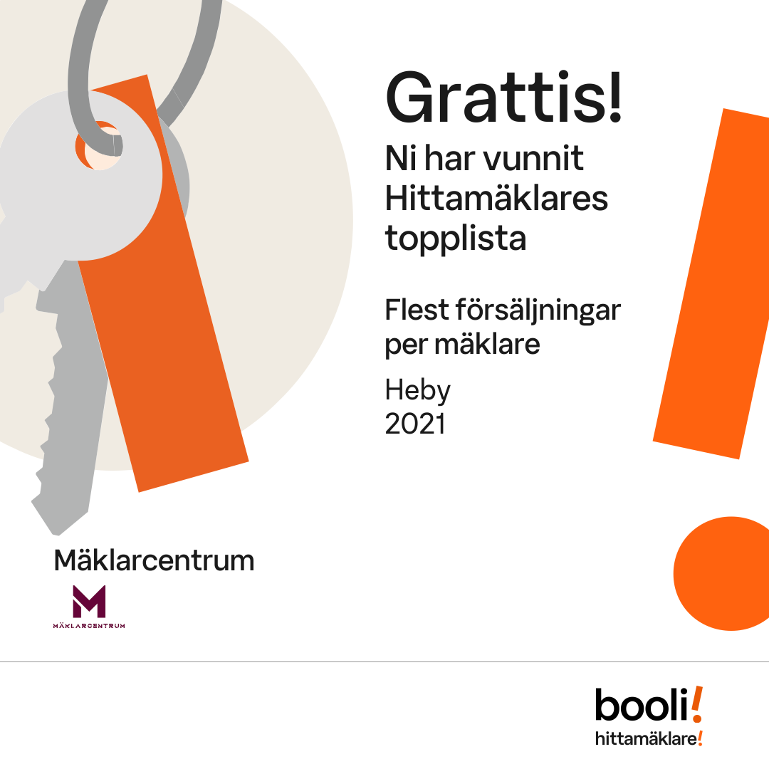 Statistik för publicerade bostäder, försäljningar och omdömen baseras på data från Booli och Hittamäklare. Statistiken för försäljningar avser inrapporterade och verifierade slutpriser från mäklare eller av Booli inhämtade och verifierade slutpriser. Statistiken för publicerade bostäder baseras på information som publicerats på Booli.se. Statistik för omdömen och rekommendationer baseras på omdömen från säljare som lämnats via Booli och Hittamäklare.