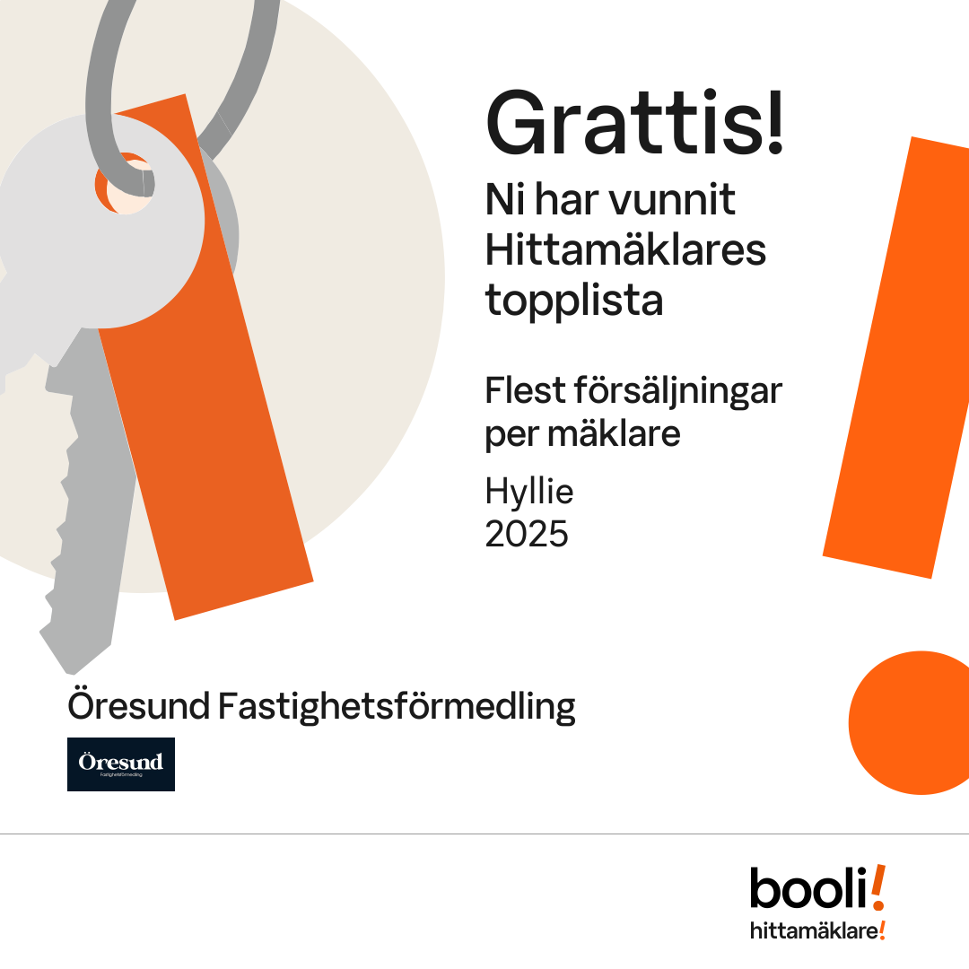 Statistik för publicerade bostäder, försäljningar och omdömen baseras på data från Booli och Hittamäklare. Statistiken för försäljningar avser inrapporterade och verifierade slutpriser från mäklare eller av Booli inhämtade och verifierade slutpriser. Statistiken för publicerade bostäder baseras på information som publicerats på Booli.se. Statistik för omdömen och rekommendationer baseras på omdömen från säljare som lämnats via Booli och Hittamäklare.
