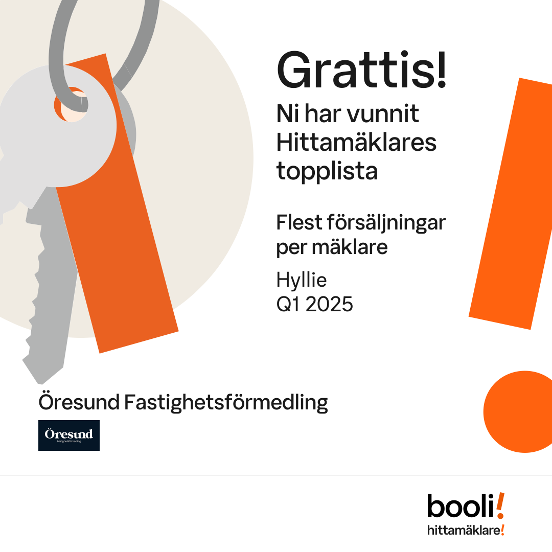 Statistik för publicerade bostäder, försäljningar och omdömen baseras på data från Booli och Hittamäklare. Statistiken för försäljningar avser inrapporterade och verifierade slutpriser från mäklare eller av Booli inhämtade och verifierade slutpriser. Statistiken för publicerade bostäder baseras på information som publicerats på Booli.se. Statistik för omdömen och rekommendationer baseras på omdömen från säljare som lämnats via Booli och Hittamäklare.
