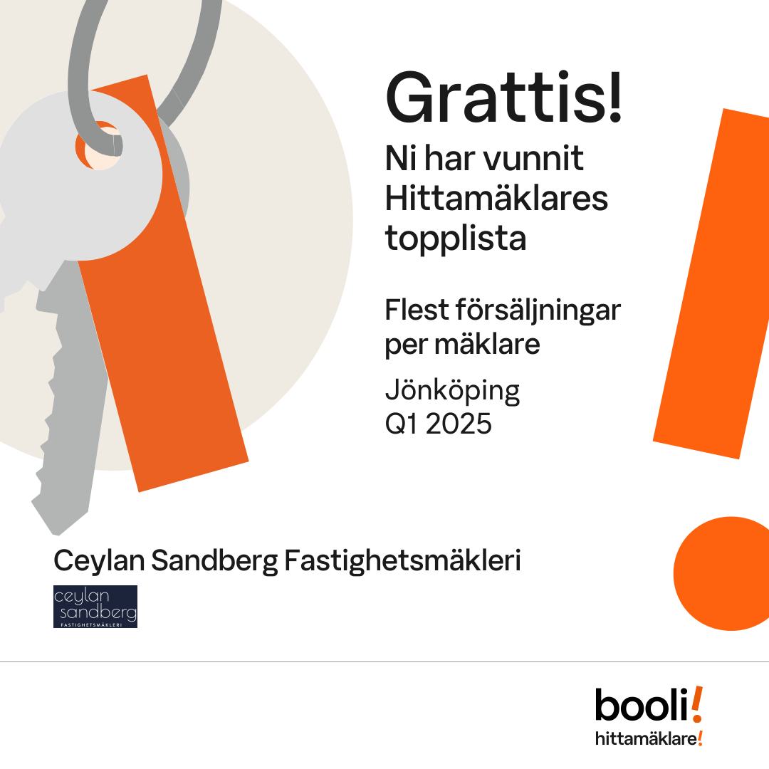 Statistik för publicerade bostäder, försäljningar och omdömen baseras på data från Booli och Hittamäklare. Statistiken för försäljningar avser inrapporterade och verifierade slutpriser från mäklare eller av Booli inhämtade och verifierade slutpriser. Statistiken för publicerade bostäder baseras på information som publicerats på Booli.se. Statistik för omdömen och rekommendationer baseras på omdömen från säljare som lämnats via Booli och Hittamäklare.