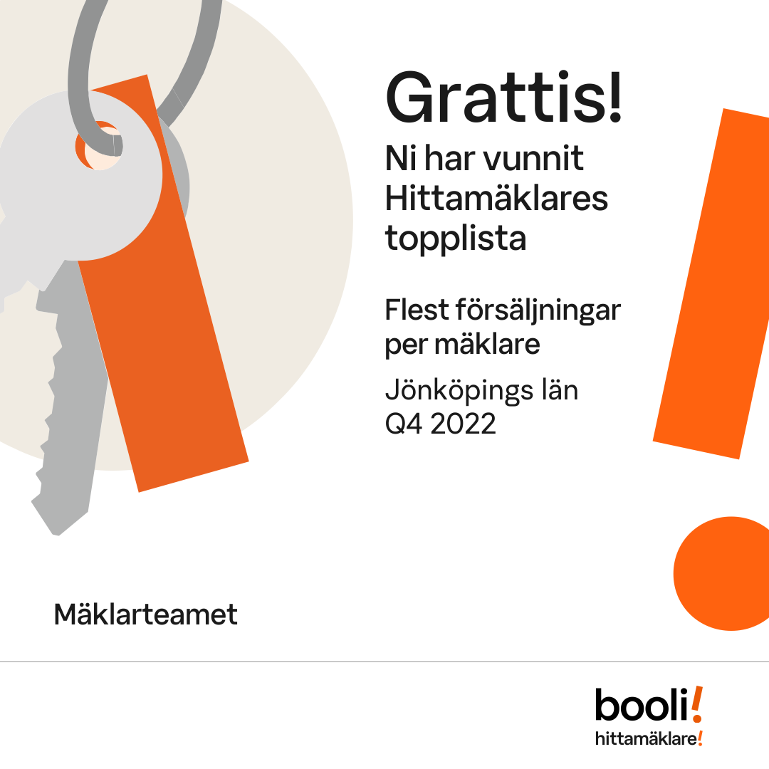 Statistik för publicerade bostäder, försäljningar och omdömen baseras på data från Booli och Hittamäklare. Statistiken för försäljningar avser inrapporterade och verifierade slutpriser från mäklare eller av Booli inhämtade och verifierade slutpriser. Statistiken för publicerade bostäder baseras på information som publicerats på Booli.se. Statistik för omdömen och rekommendationer baseras på omdömen från säljare som lämnats via Booli och Hittamäklare.