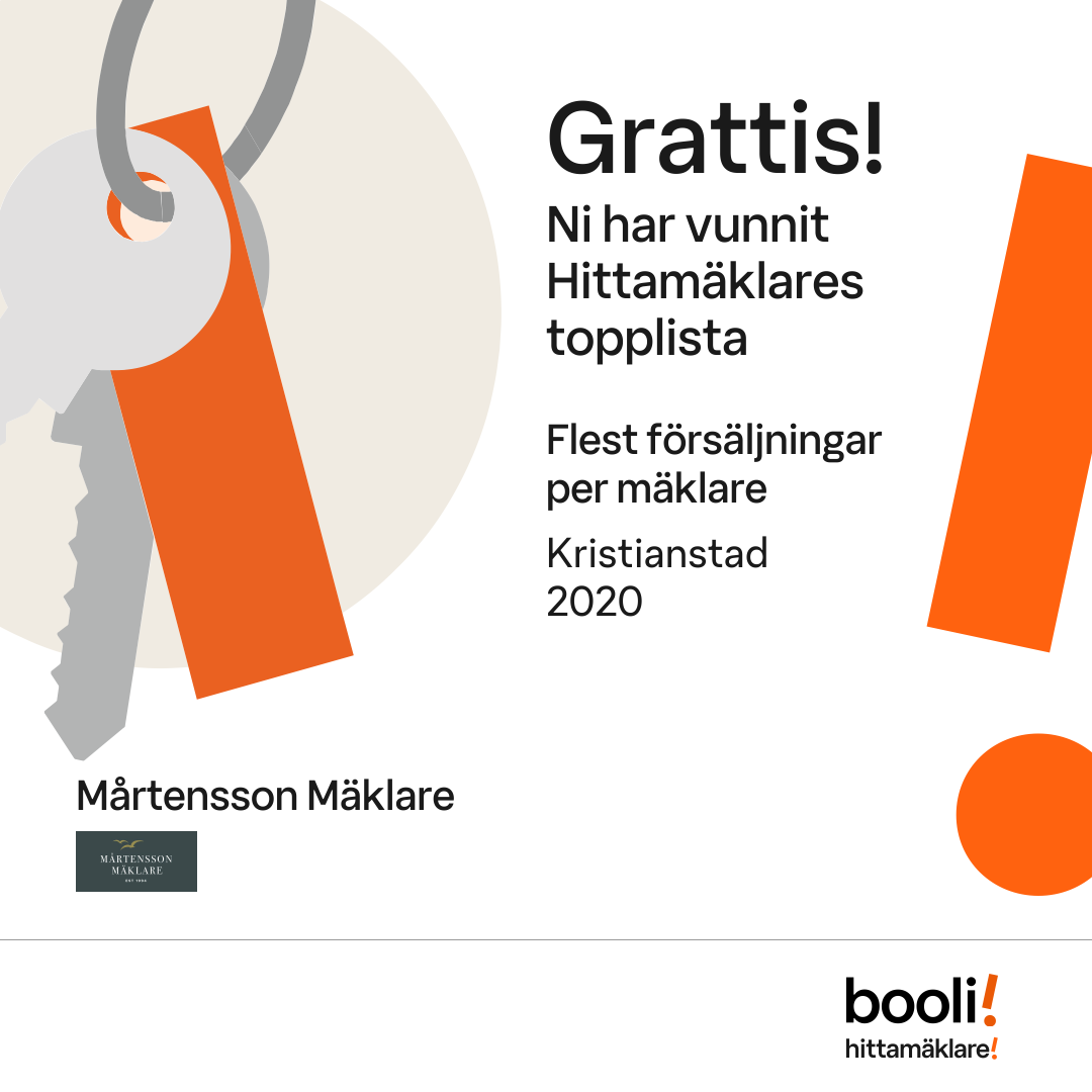 Statistik för publicerade bostäder, försäljningar och omdömen baseras på data från Booli och Hittamäklare. Statistiken för försäljningar avser inrapporterade och verifierade slutpriser från mäklare eller av Booli inhämtade och verifierade slutpriser. Statistiken för publicerade bostäder baseras på information som publicerats på Booli.se. Statistik för omdömen och rekommendationer baseras på omdömen från säljare som lämnats via Booli och Hittamäklare.