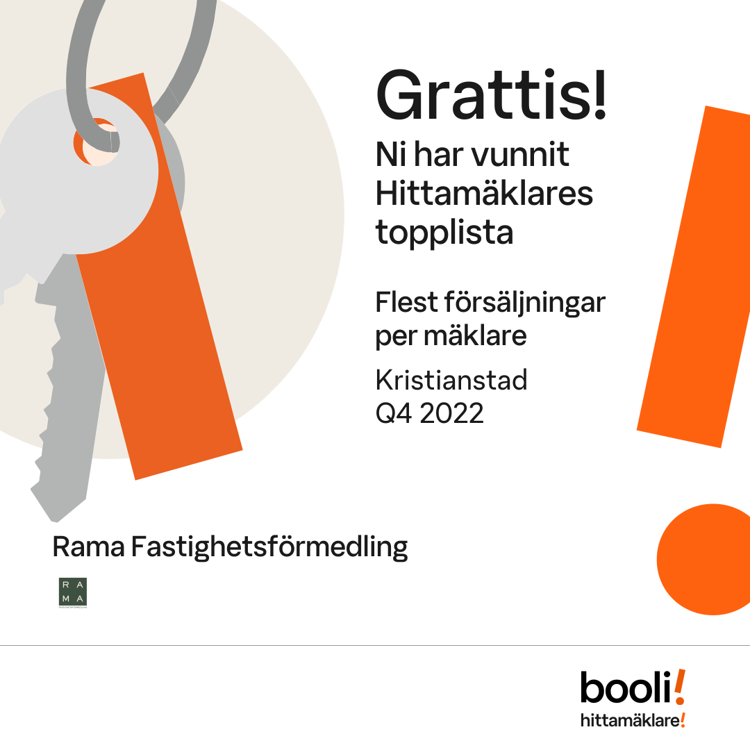 Statistik för publicerade bostäder, försäljningar och omdömen baseras på data från Booli och Hittamäklare. Statistiken för försäljningar avser inrapporterade och verifierade slutpriser från mäklare eller av Booli inhämtade och verifierade slutpriser. Statistiken för publicerade bostäder baseras på information som publicerats på Booli.se. Statistik för omdömen och rekommendationer baseras på omdömen från säljare som lämnats via Booli och Hittamäklare.