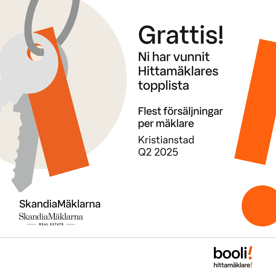Statistik för publicerade bostäder, försäljningar och omdömen baseras på data från Booli och Hittamäklare. Statistiken för försäljningar avser inrapporterade och verifierade slutpriser från mäklare eller av Booli inhämtade och verifierade slutpriser. Statistiken för publicerade bostäder baseras på information som publicerats på Booli.se. Statistik för omdömen och rekommendationer baseras på omdömen från säljare som lämnats via Booli och Hittamäklare.
