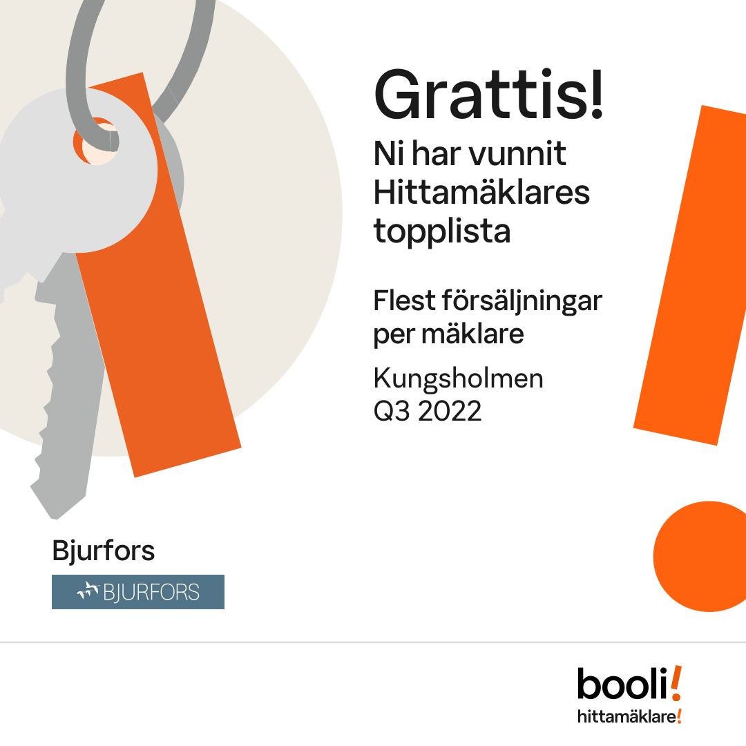 Statistik för publicerade bostäder, försäljningar och omdömen baseras på data från Booli och Hittamäklare. Statistiken för försäljningar avser inrapporterade och verifierade slutpriser från mäklare eller av Booli inhämtade och verifierade slutpriser. Statistiken för publicerade bostäder baseras på information som publicerats på Booli.se. Statistik för omdömen och rekommendationer baseras på omdömen från säljare som lämnats via Booli och Hittamäklare.