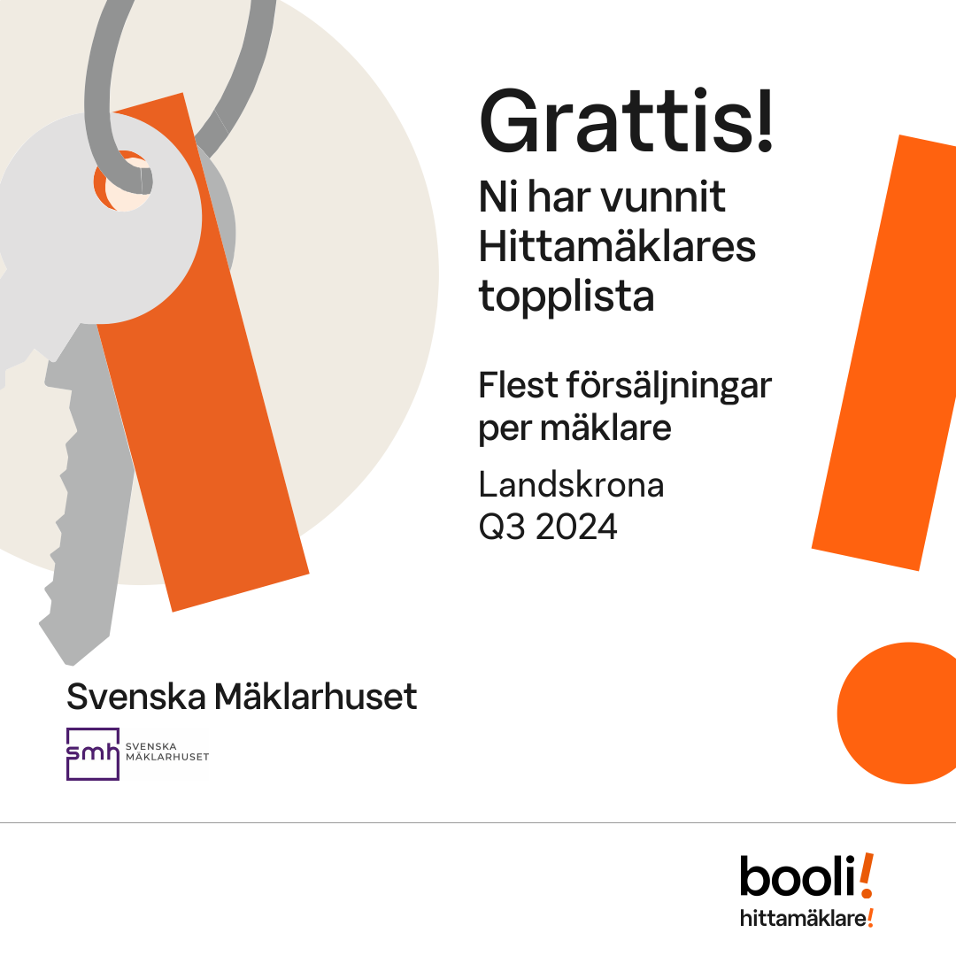 Statistik för publicerade bostäder, försäljningar och omdömen baseras på data från Booli och Hittamäklare. Statistiken för försäljningar avser inrapporterade och verifierade slutpriser från mäklare eller av Booli inhämtade och verifierade slutpriser. Statistiken för publicerade bostäder baseras på information som publicerats på Booli.se. Statistik för omdömen och rekommendationer baseras på omdömen från säljare som lämnats via Booli och Hittamäklare.