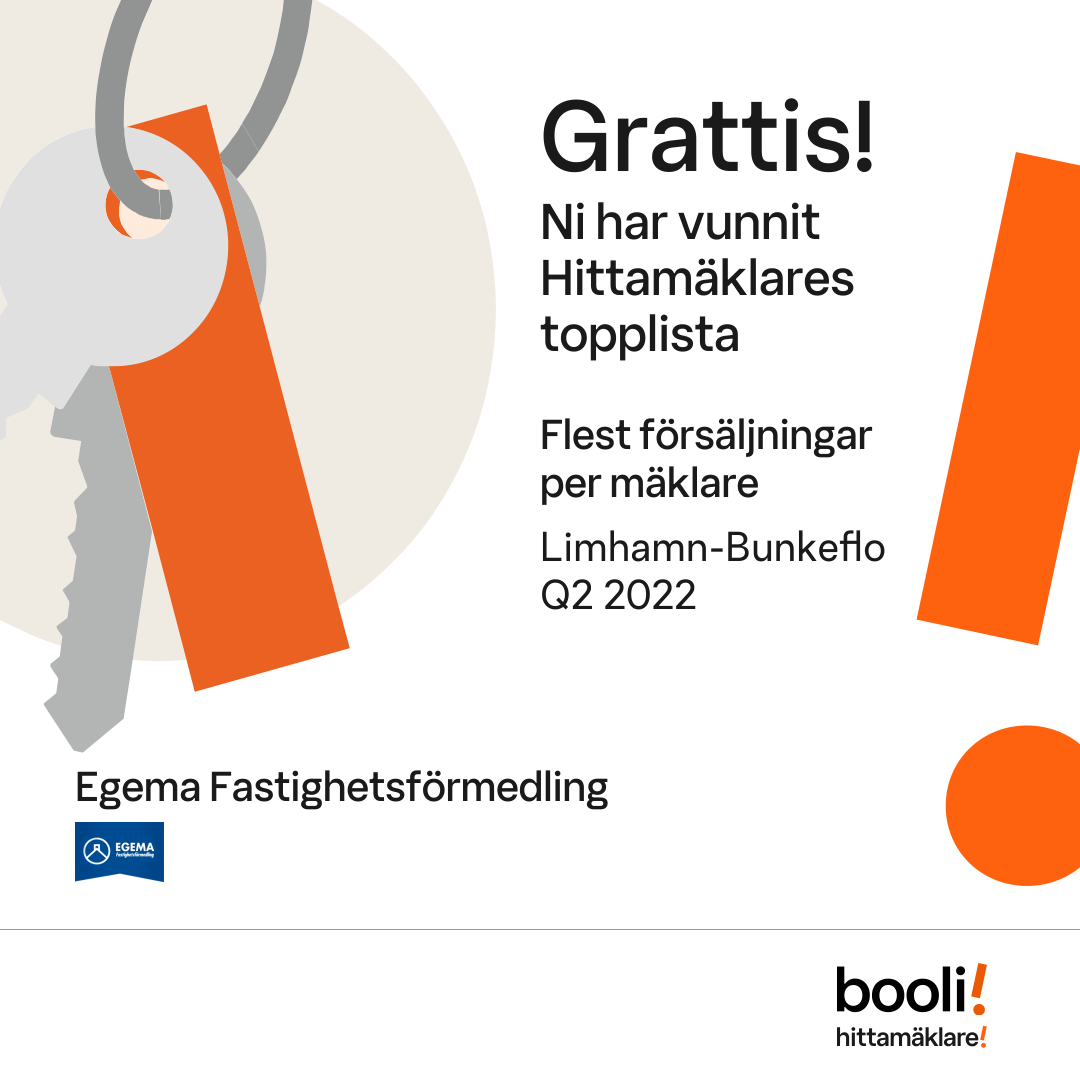 Statistik för publicerade bostäder, försäljningar och omdömen baseras på data från Booli och Hittamäklare. Statistiken för försäljningar avser inrapporterade och verifierade slutpriser från mäklare eller av Booli inhämtade och verifierade slutpriser. Statistiken för publicerade bostäder baseras på information som publicerats på Booli.se. Statistik för omdömen och rekommendationer baseras på omdömen från säljare som lämnats via Booli och Hittamäklare.