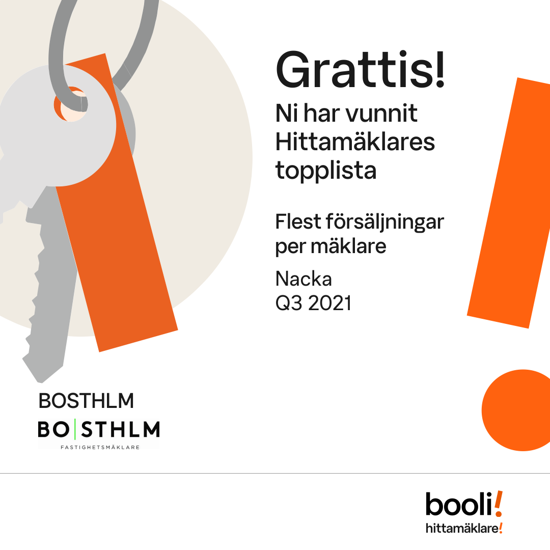 Statistik för publicerade bostäder, försäljningar och omdömen baseras på data från Booli och Hittamäklare. Statistiken för försäljningar avser inrapporterade och verifierade slutpriser från mäklare eller av Booli inhämtade och verifierade slutpriser. Statistiken för publicerade bostäder baseras på information som publicerats på Booli.se. Statistik för omdömen och rekommendationer baseras på omdömen från säljare som lämnats via Booli och Hittamäklare.