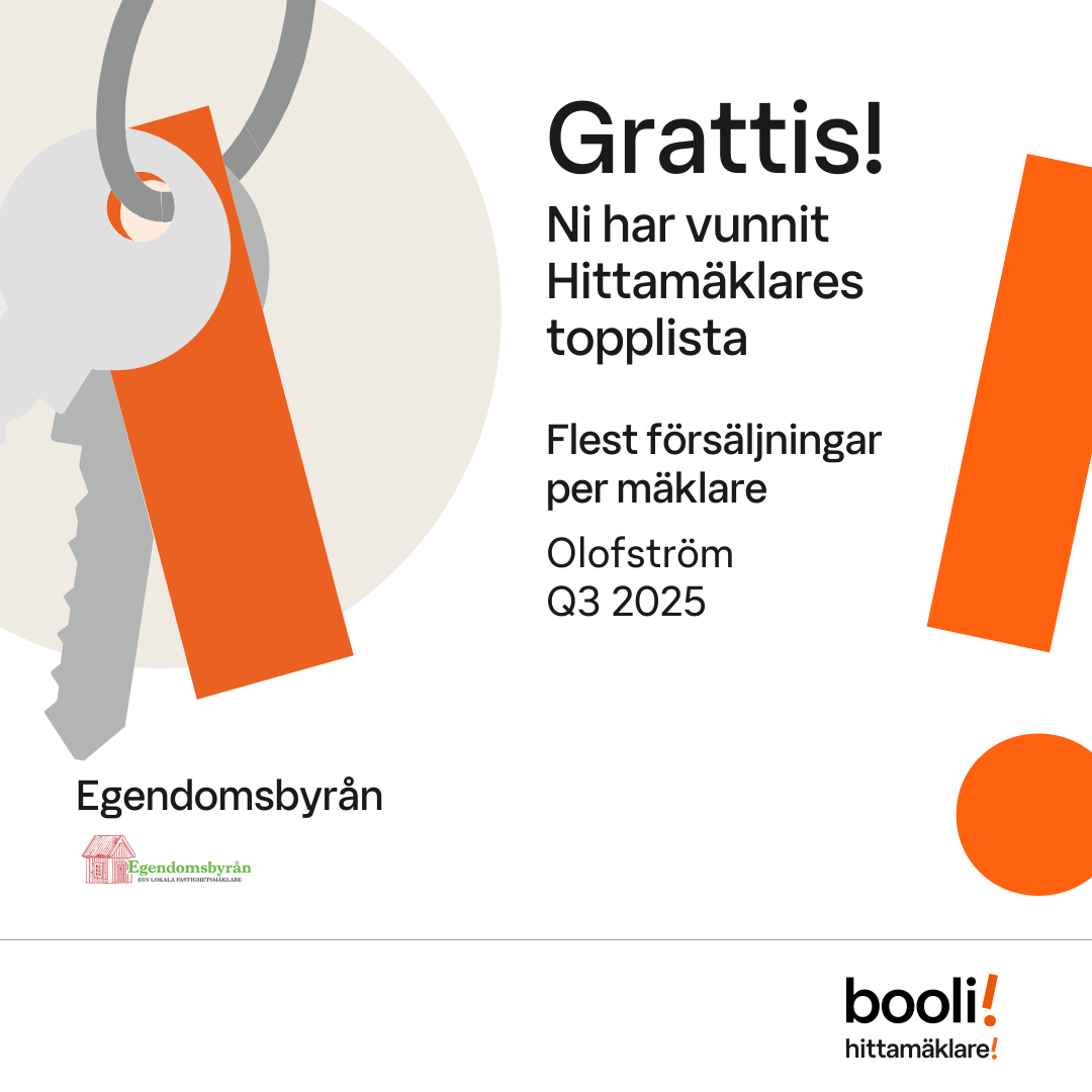 Statistik för publicerade bostäder, försäljningar och omdömen baseras på data från Booli och Hittamäklare. Statistiken för försäljningar avser inrapporterade och verifierade slutpriser från mäklare eller av Booli inhämtade och verifierade slutpriser. Statistiken för publicerade bostäder baseras på information som publicerats på Booli.se. Statistik för omdömen och rekommendationer baseras på omdömen från säljare som lämnats via Booli och Hittamäklare.