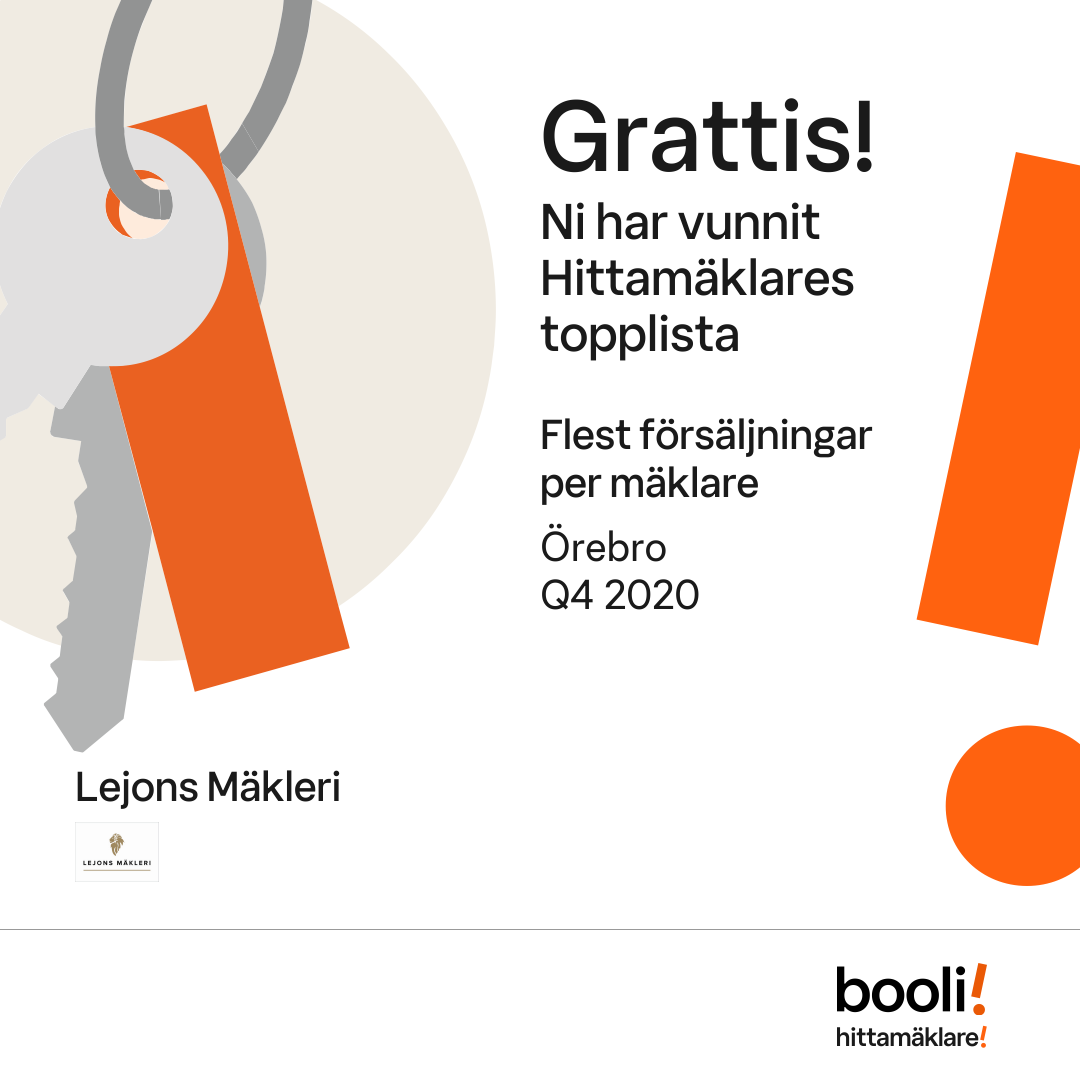 Statistik för publicerade bostäder, försäljningar och omdömen baseras på data från Booli och Hittamäklare. Statistiken för försäljningar avser inrapporterade och verifierade slutpriser från mäklare eller av Booli inhämtade och verifierade slutpriser. Statistiken för publicerade bostäder baseras på information som publicerats på Booli.se. Statistik för omdömen och rekommendationer baseras på omdömen från säljare som lämnats via Booli och Hittamäklare.