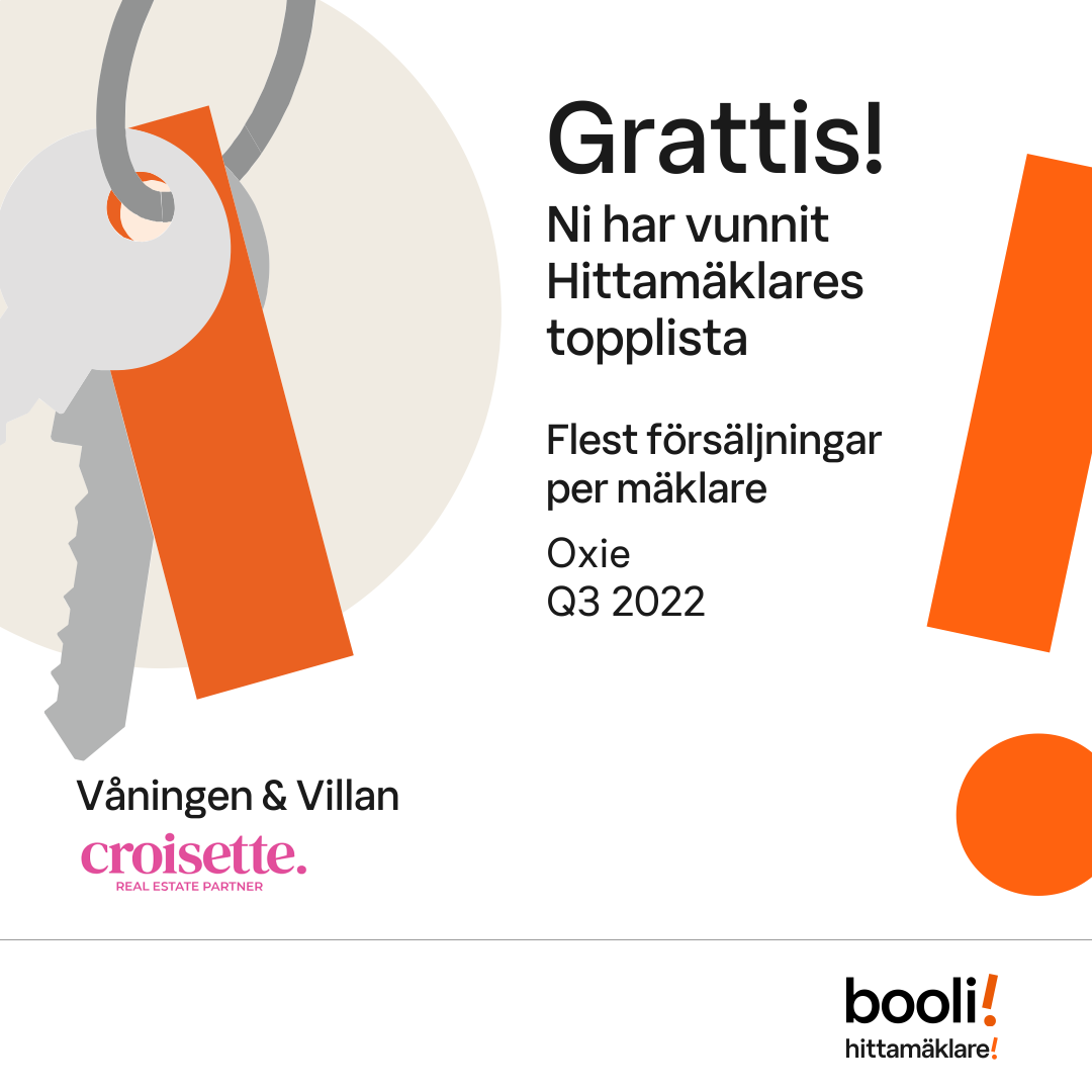Statistik för publicerade bostäder, försäljningar och omdömen baseras på data från Booli och Hittamäklare. Statistiken för försäljningar avser inrapporterade och verifierade slutpriser från mäklare eller av Booli inhämtade och verifierade slutpriser. Statistiken för publicerade bostäder baseras på information som publicerats på Booli.se. Statistik för omdömen och rekommendationer baseras på omdömen från säljare som lämnats via Booli och Hittamäklare.