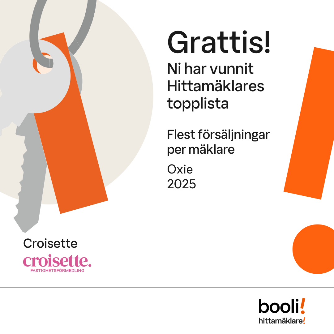 Statistik för publicerade bostäder, försäljningar och omdömen baseras på data från Booli och Hittamäklare. Statistiken för försäljningar avser inrapporterade och verifierade slutpriser från mäklare eller av Booli inhämtade och verifierade slutpriser. Statistiken för publicerade bostäder baseras på information som publicerats på Booli.se. Statistik för omdömen och rekommendationer baseras på omdömen från säljare som lämnats via Booli och Hittamäklare.