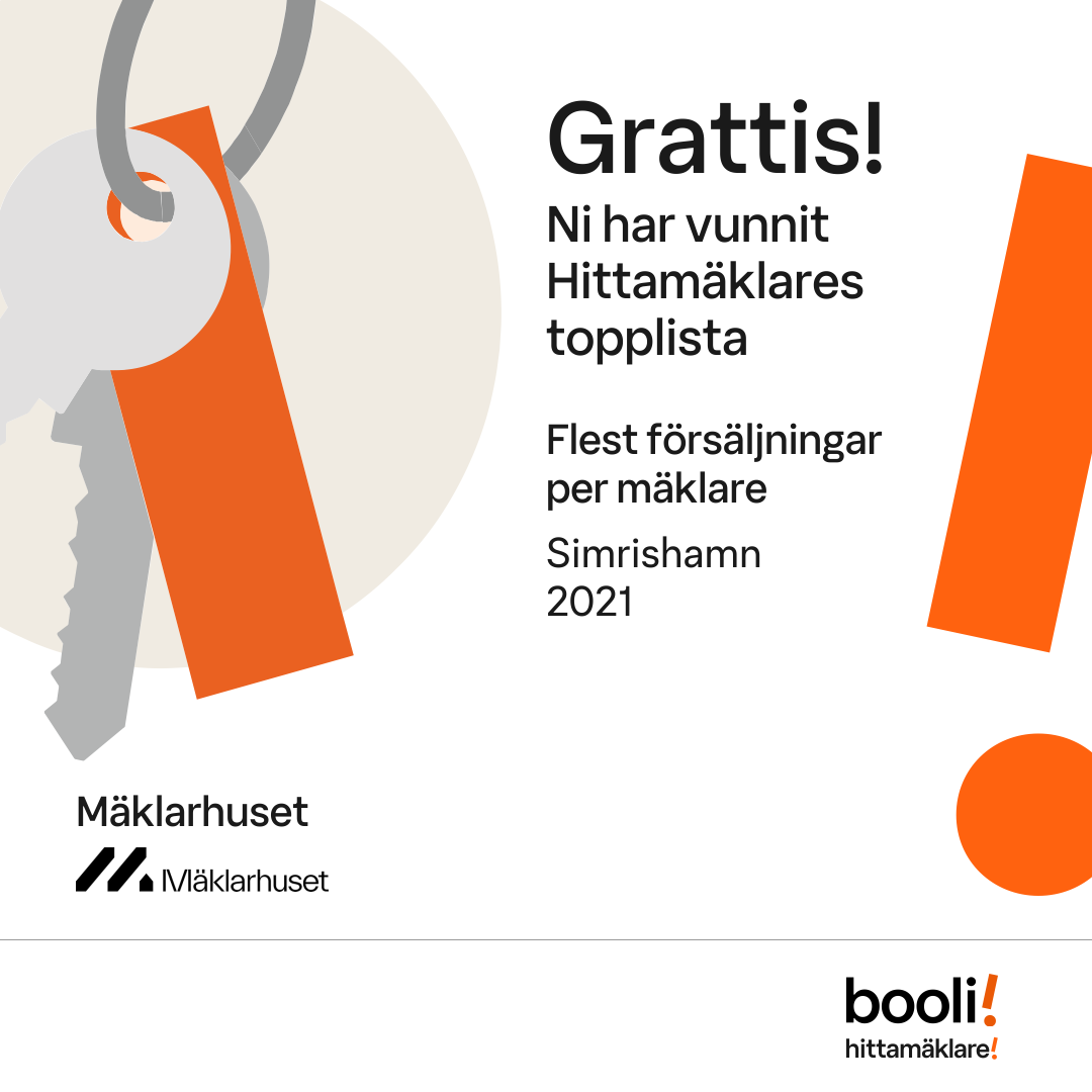 Statistik för publicerade bostäder, försäljningar och omdömen baseras på data från Booli och Hittamäklare. Statistiken för försäljningar avser inrapporterade och verifierade slutpriser från mäklare eller av Booli inhämtade och verifierade slutpriser. Statistiken för publicerade bostäder baseras på information som publicerats på Booli.se. Statistik för omdömen och rekommendationer baseras på omdömen från säljare som lämnats via Booli och Hittamäklare.