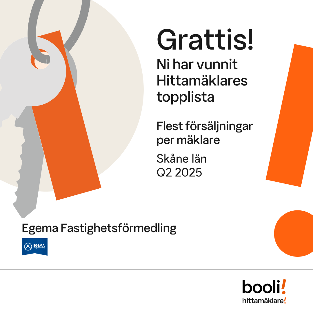 Statistik för publicerade bostäder, försäljningar och omdömen baseras på data från Booli och Hittamäklare. Statistiken för försäljningar avser inrapporterade och verifierade slutpriser från mäklare eller av Booli inhämtade och verifierade slutpriser. Statistiken för publicerade bostäder baseras på information som publicerats på Booli.se. Statistik för omdömen och rekommendationer baseras på omdömen från säljare som lämnats via Booli och Hittamäklare.