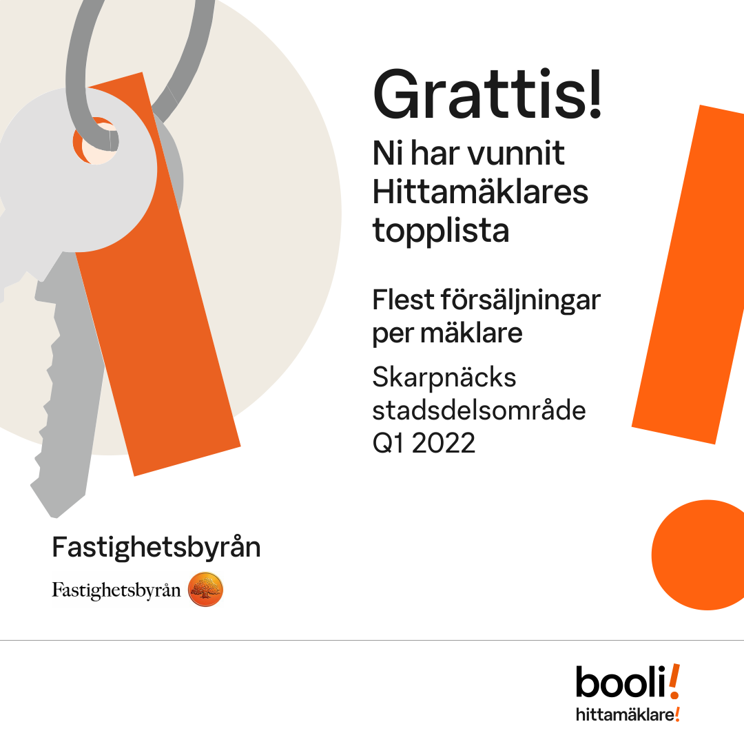Statistik för publicerade bostäder, försäljningar och omdömen baseras på data från Booli och Hittamäklare. Statistiken för försäljningar avser inrapporterade och verifierade slutpriser från mäklare eller av Booli inhämtade och verifierade slutpriser. Statistiken för publicerade bostäder baseras på information som publicerats på Booli.se. Statistik för omdömen och rekommendationer baseras på omdömen från säljare som lämnats via Booli och Hittamäklare.