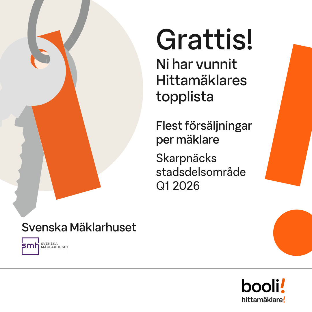 Statistik för publicerade bostäder, försäljningar och omdömen baseras på data från Booli och Hittamäklare. Statistiken för försäljningar avser inrapporterade och verifierade slutpriser från mäklare eller av Booli inhämtade och verifierade slutpriser. Statistiken för publicerade bostäder baseras på information som publicerats på Booli.se. Statistik för omdömen och rekommendationer baseras på omdömen från säljare som lämnats via Booli och Hittamäklare.
