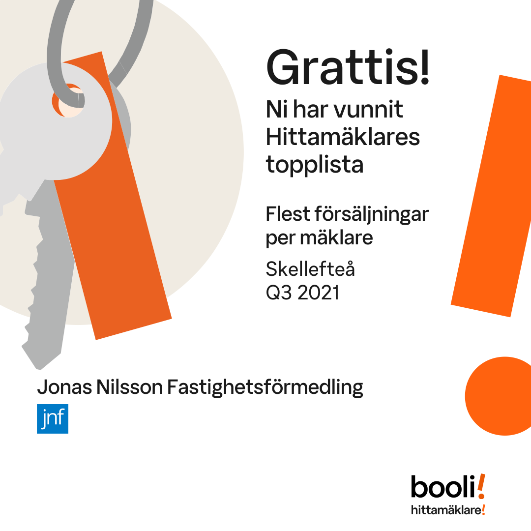 Statistik för publicerade bostäder, försäljningar och omdömen baseras på data från Booli och Hittamäklare. Statistiken för försäljningar avser inrapporterade och verifierade slutpriser från mäklare eller av Booli inhämtade och verifierade slutpriser. Statistiken för publicerade bostäder baseras på information som publicerats på Booli.se. Statistik för omdömen och rekommendationer baseras på omdömen från säljare som lämnats via Booli och Hittamäklare.