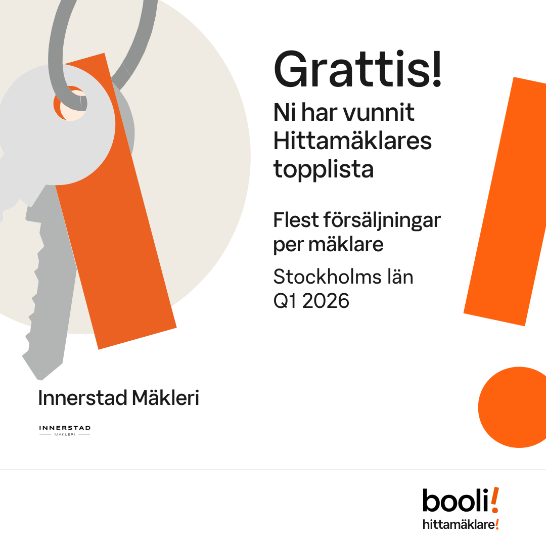 Statistik för publicerade bostäder, försäljningar och omdömen baseras på data från Booli. Statistiken för försäljningar avser inrapporterade och verifierade slutpriser från mäklare eller av Booli inhämtade och verifierade slutpriser. Statistiken för publicerade bostäder baseras på information som publicerats på Booli.se. Statistik för omdömen och rekommendationer baseras på omdömen från säljare som lämnats via Booli.