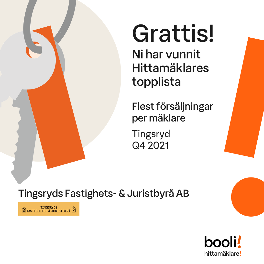 Statistik för publicerade bostäder, försäljningar och omdömen baseras på data från Booli och Hittamäklare. Statistiken för försäljningar avser inrapporterade och verifierade slutpriser från mäklare eller av Booli inhämtade och verifierade slutpriser. Statistiken för publicerade bostäder baseras på information som publicerats på Booli.se. Statistik för omdömen och rekommendationer baseras på omdömen från säljare som lämnats via Booli och Hittamäklare.