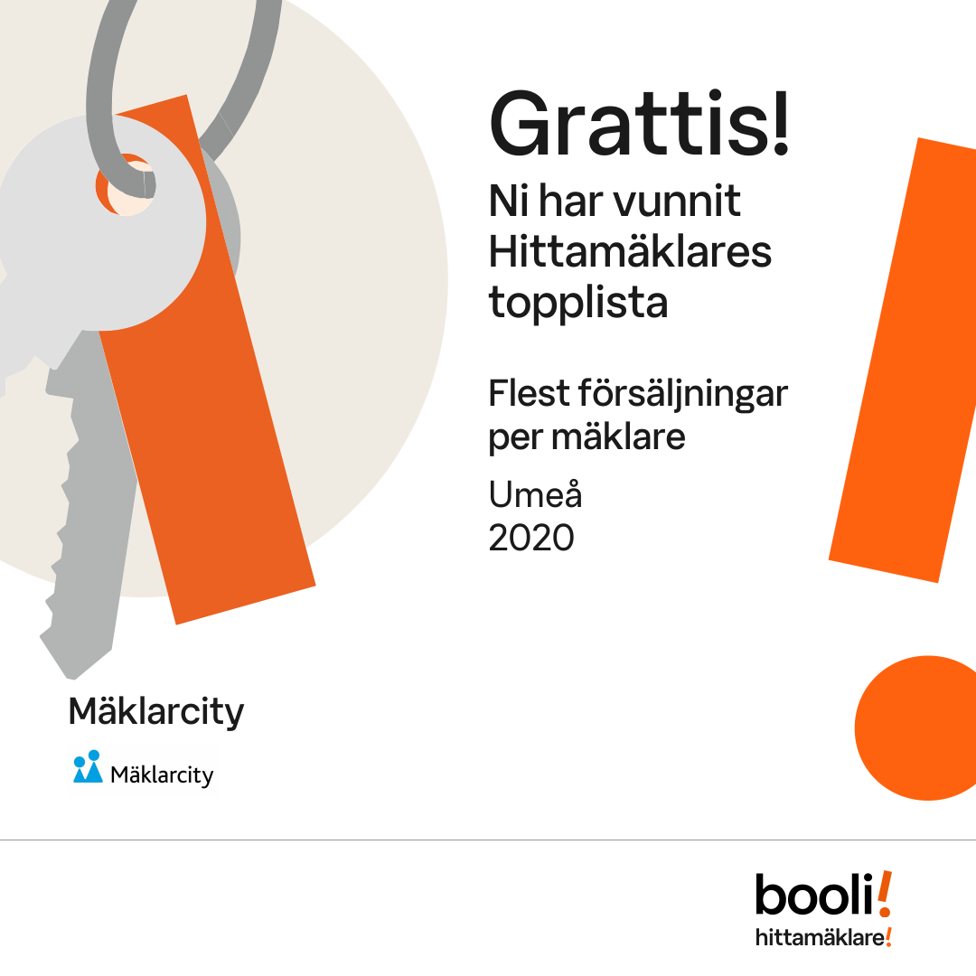 Statistik för publicerade bostäder, försäljningar och omdömen baseras på data från Booli och Hittamäklare. Statistiken för försäljningar avser inrapporterade och verifierade slutpriser från mäklare eller av Booli inhämtade och verifierade slutpriser. Statistiken för publicerade bostäder baseras på information som publicerats på Booli.se. Statistik för omdömen och rekommendationer baseras på omdömen från säljare som lämnats via Booli och Hittamäklare.