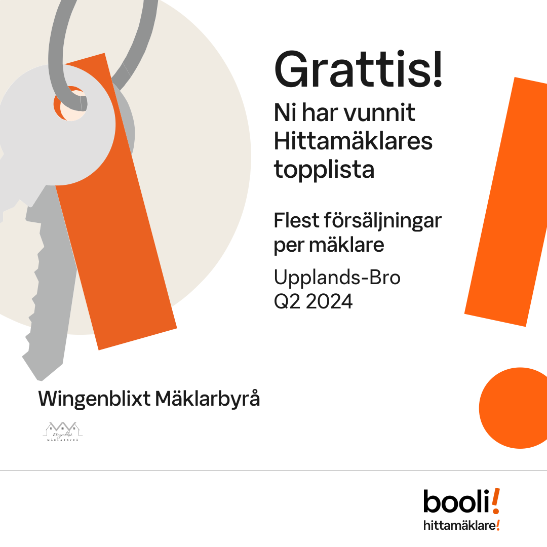 Statistik för publicerade bostäder, försäljningar och omdömen baseras på data från Booli och Hittamäklare. Statistiken för försäljningar avser inrapporterade och verifierade slutpriser från mäklare eller av Booli inhämtade och verifierade slutpriser. Statistiken för publicerade bostäder baseras på information som publicerats på Booli.se. Statistik för omdömen och rekommendationer baseras på omdömen från säljare som lämnats via Booli och Hittamäklare.