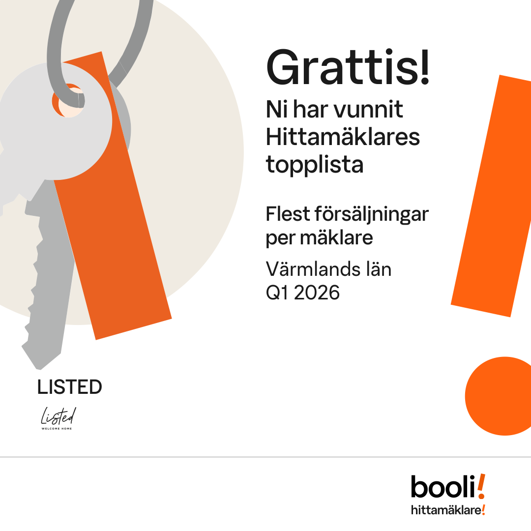 Statistik för publicerade bostäder, försäljningar och omdömen baseras på data från Booli. Statistiken för försäljningar avser inrapporterade och verifierade slutpriser från mäklare eller av Booli inhämtade och verifierade slutpriser. Statistiken för publicerade bostäder baseras på information som publicerats på Booli.se. Statistik för omdömen och rekommendationer baseras på omdömen från säljare som lämnats via Booli.