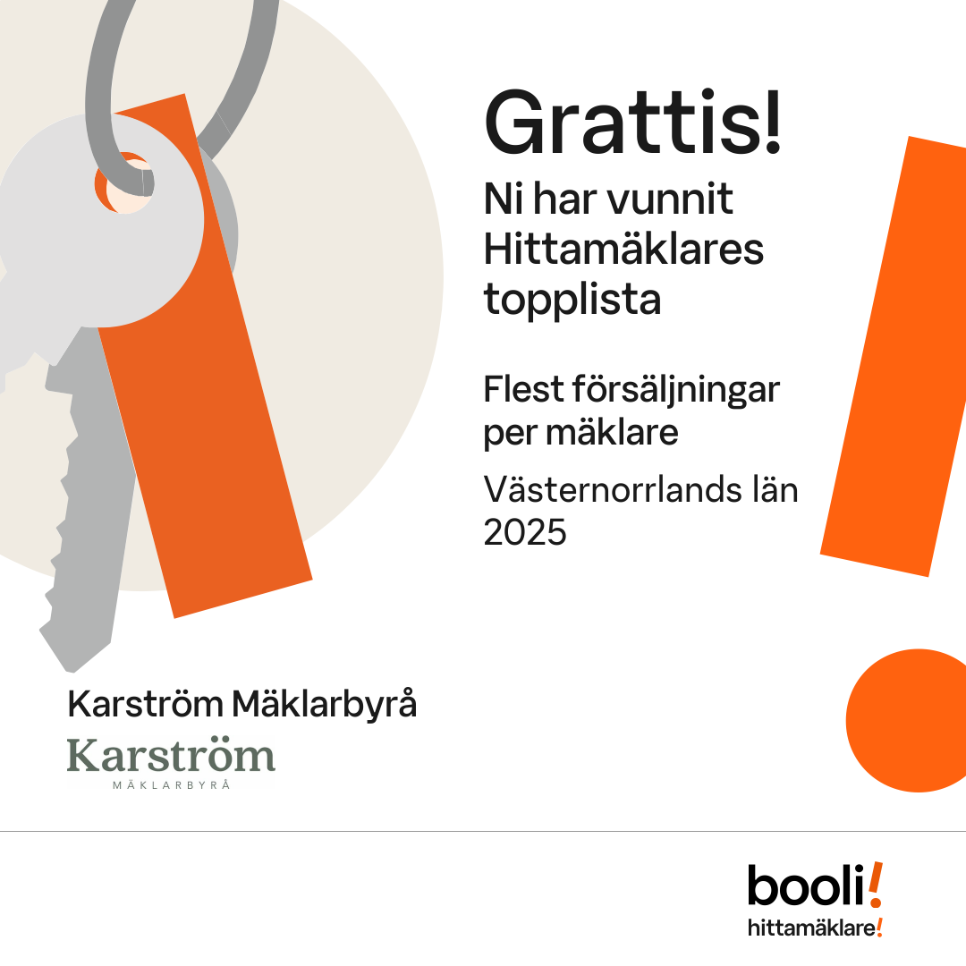 Statistik för publicerade bostäder, försäljningar och omdömen baseras på data från Booli och Hittamäklare. Statistiken för försäljningar avser inrapporterade och verifierade slutpriser från mäklare eller av Booli inhämtade och verifierade slutpriser. Statistiken för publicerade bostäder baseras på information som publicerats på Booli.se. Statistik för omdömen och rekommendationer baseras på omdömen från säljare som lämnats via Booli och Hittamäklare.