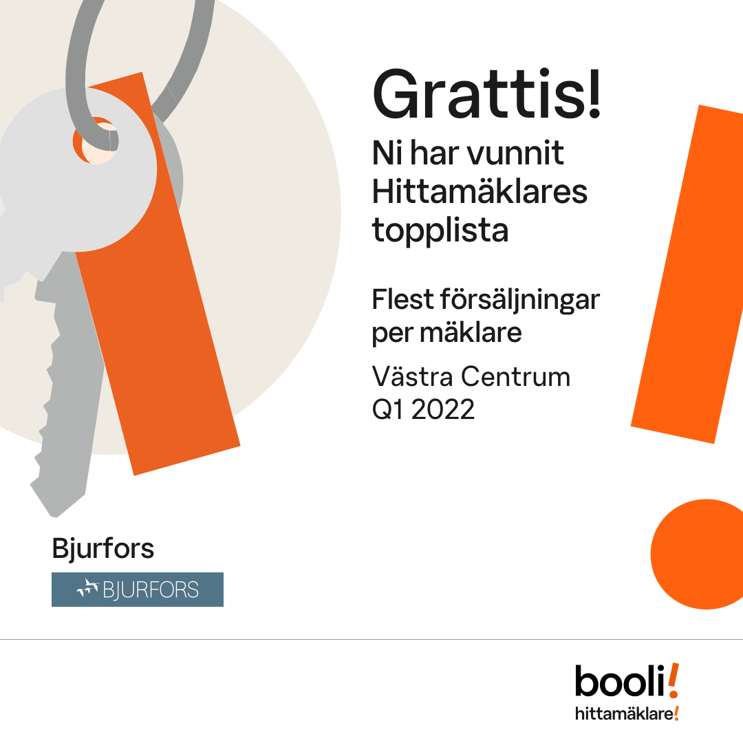 Statistik för publicerade bostäder, försäljningar och omdömen baseras på data från Booli och Hittamäklare. Statistiken för försäljningar avser inrapporterade och verifierade slutpriser från mäklare eller av Booli inhämtade och verifierade slutpriser. Statistiken för publicerade bostäder baseras på information som publicerats på Booli.se. Statistik för omdömen och rekommendationer baseras på omdömen från säljare som lämnats via Booli och Hittamäklare.