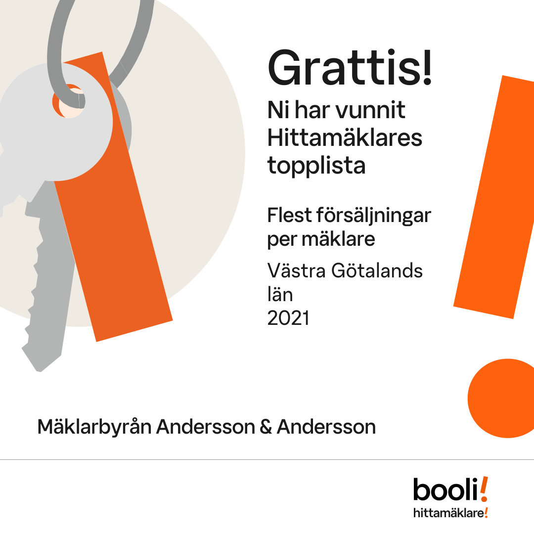 Statistik för publicerade bostäder, försäljningar och omdömen baseras på data från Booli och Hittamäklare. Statistiken för försäljningar avser inrapporterade och verifierade slutpriser från mäklare eller av Booli inhämtade och verifierade slutpriser. Statistiken för publicerade bostäder baseras på information som publicerats på Booli.se. Statistik för omdömen och rekommendationer baseras på omdömen från säljare som lämnats via Booli och Hittamäklare.