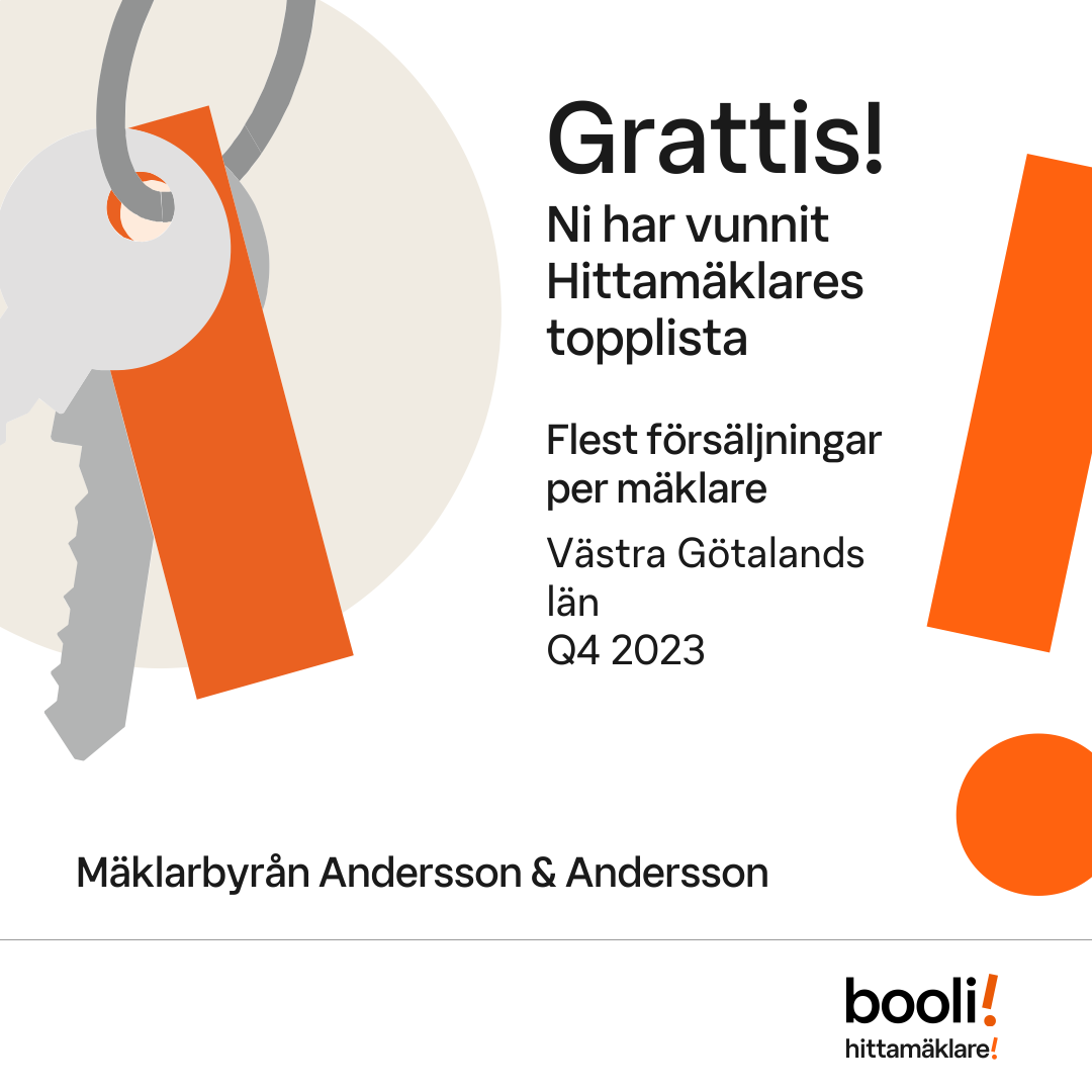 Statistik för publicerade bostäder, försäljningar och omdömen baseras på data från Booli och Hittamäklare. Statistiken för försäljningar avser inrapporterade och verifierade slutpriser från mäklare eller av Booli inhämtade och verifierade slutpriser. Statistiken för publicerade bostäder baseras på information som publicerats på Booli.se. Statistik för omdömen och rekommendationer baseras på omdömen från säljare som lämnats via Booli och Hittamäklare.