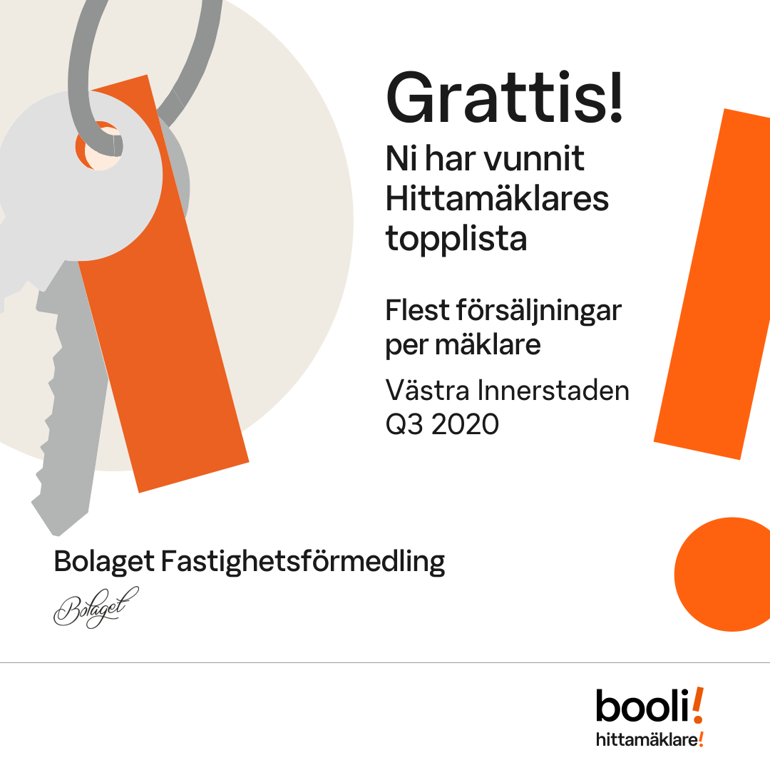 Statistik för publicerade bostäder, försäljningar och omdömen baseras på data från Booli och Hittamäklare. Statistiken för försäljningar avser inrapporterade och verifierade slutpriser från mäklare eller av Booli inhämtade och verifierade slutpriser. Statistiken för publicerade bostäder baseras på information som publicerats på Booli.se. Statistik för omdömen och rekommendationer baseras på omdömen från säljare som lämnats via Booli och Hittamäklare.