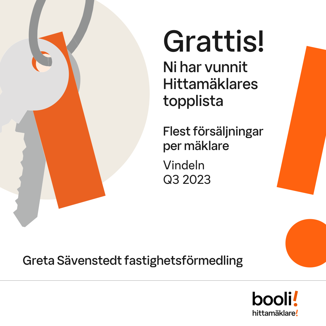 Statistik för publicerade bostäder, försäljningar och omdömen baseras på data från Booli och Hittamäklare. Statistiken för försäljningar avser inrapporterade och verifierade slutpriser från mäklare eller av Booli inhämtade och verifierade slutpriser. Statistiken för publicerade bostäder baseras på information som publicerats på Booli.se. Statistik för omdömen och rekommendationer baseras på omdömen från säljare som lämnats via Booli och Hittamäklare.