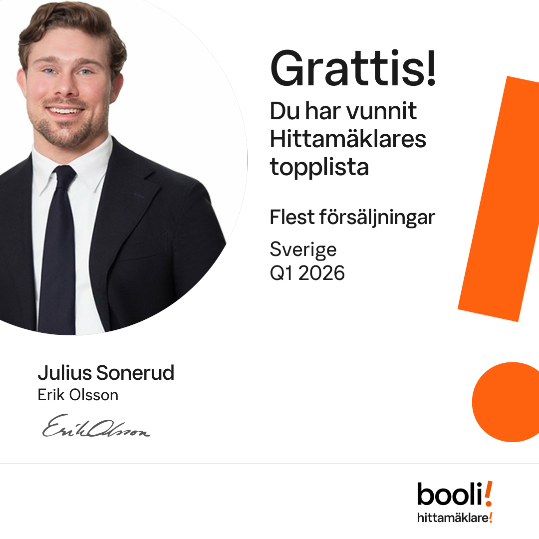 Statistik för publicerade bostäder, försäljningar och omdömen baseras på data från Booli. Statistiken för försäljningar avser inrapporterade och verifierade slutpriser från mäklare eller av Booli inhämtade och verifierade slutpriser. Statistiken för publicerade bostäder baseras på information som publicerats på Booli.se. Statistik för omdömen och rekommendationer baseras på omdömen från säljare som lämnats via Booli.