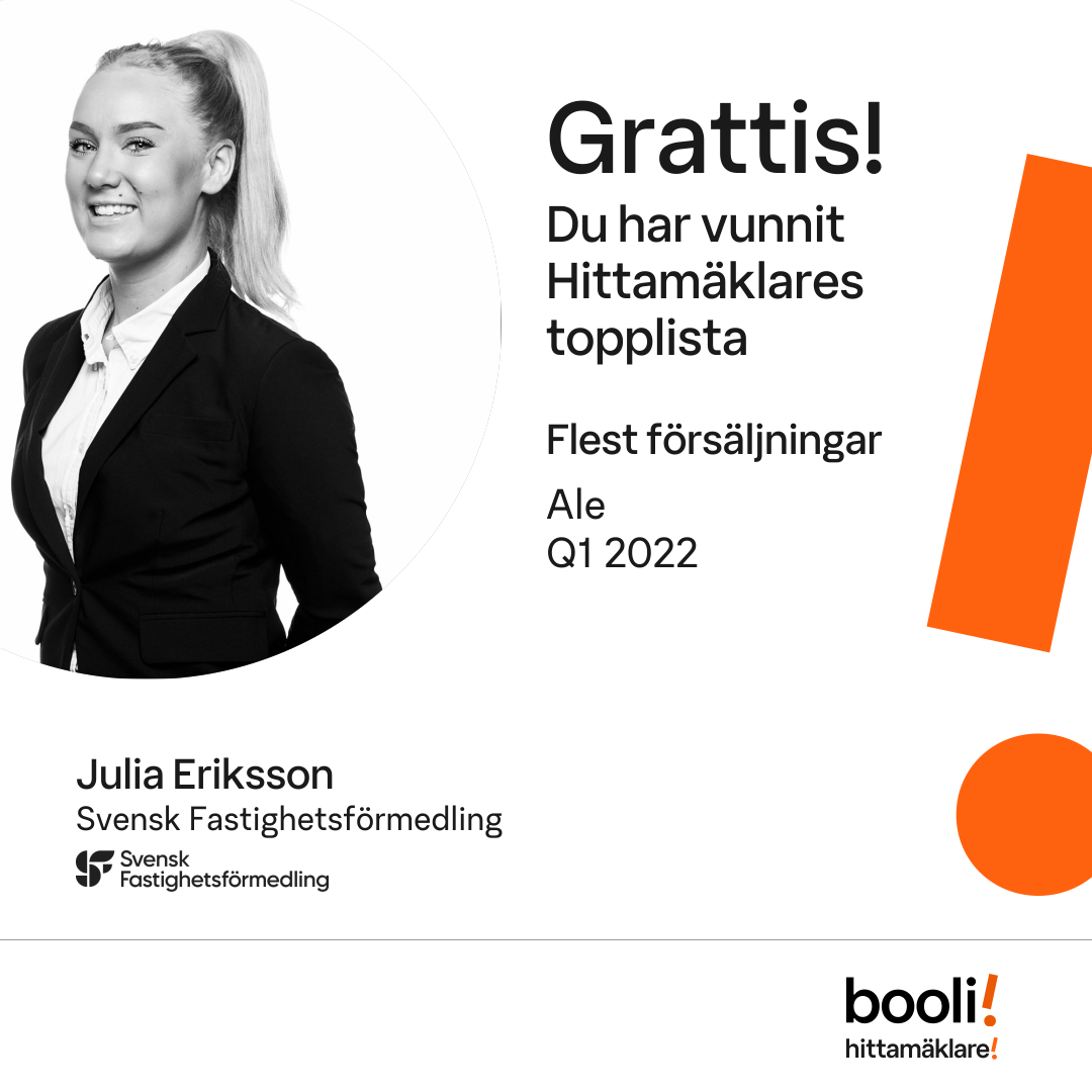 Statistik för publicerade bostäder, försäljningar och omdömen baseras på data från Booli och Hittamäklare. Statistiken för försäljningar avser inrapporterade och verifierade slutpriser från mäklare eller av Booli inhämtade och verifierade slutpriser. Statistiken för publicerade bostäder baseras på information som publicerats på Booli.se. Statistik för omdömen och rekommendationer baseras på omdömen från säljare som lämnats via Booli och Hittamäklare.