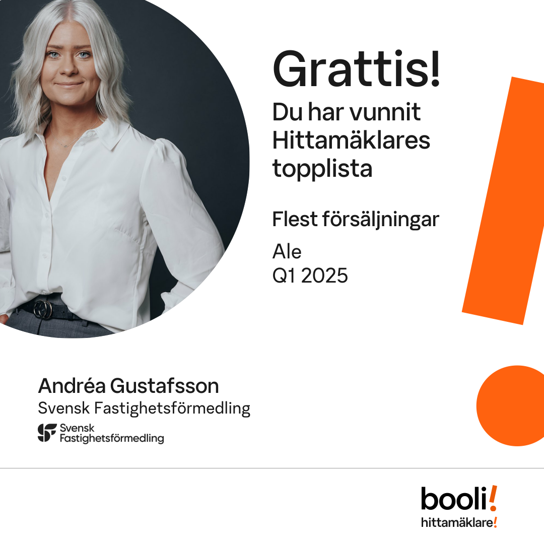 Statistik för publicerade bostäder, försäljningar och omdömen baseras på data från Booli och Hittamäklare. Statistiken för försäljningar avser inrapporterade och verifierade slutpriser från mäklare eller av Booli inhämtade och verifierade slutpriser. Statistiken för publicerade bostäder baseras på information som publicerats på Booli.se. Statistik för omdömen och rekommendationer baseras på omdömen från säljare som lämnats via Booli och Hittamäklare.