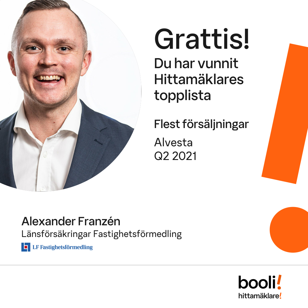 Statistik för publicerade bostäder, försäljningar och omdömen baseras på data från Booli och Hittamäklare. Statistiken för försäljningar avser inrapporterade och verifierade slutpriser från mäklare eller av Booli inhämtade och verifierade slutpriser. Statistiken för publicerade bostäder baseras på information som publicerats på Booli.se. Statistik för omdömen och rekommendationer baseras på omdömen från säljare som lämnats via Booli och Hittamäklare.