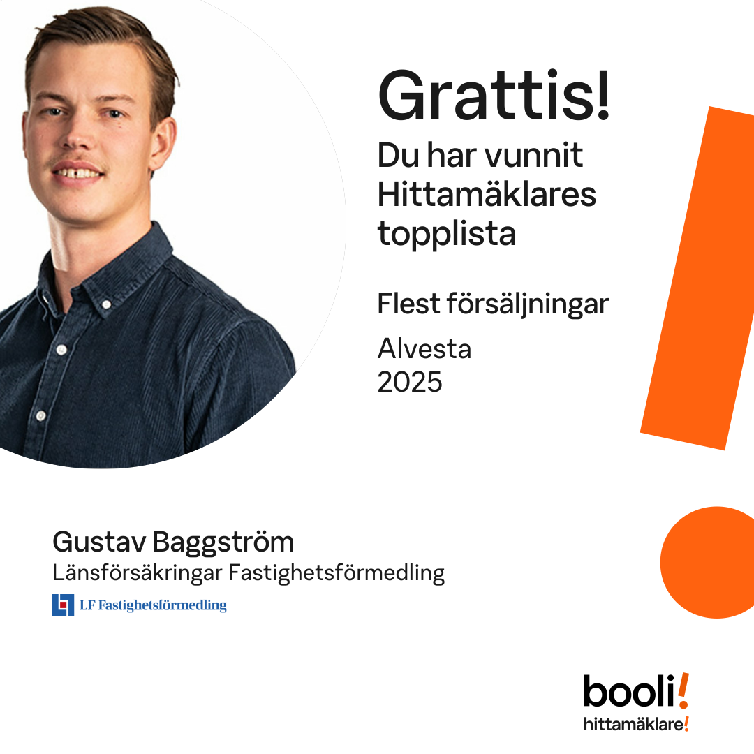 Statistik för publicerade bostäder, försäljningar och omdömen baseras på data från Booli och Hittamäklare. Statistiken för försäljningar avser inrapporterade och verifierade slutpriser från mäklare eller av Booli inhämtade och verifierade slutpriser. Statistiken för publicerade bostäder baseras på information som publicerats på Booli.se. Statistik för omdömen och rekommendationer baseras på omdömen från säljare som lämnats via Booli och Hittamäklare.