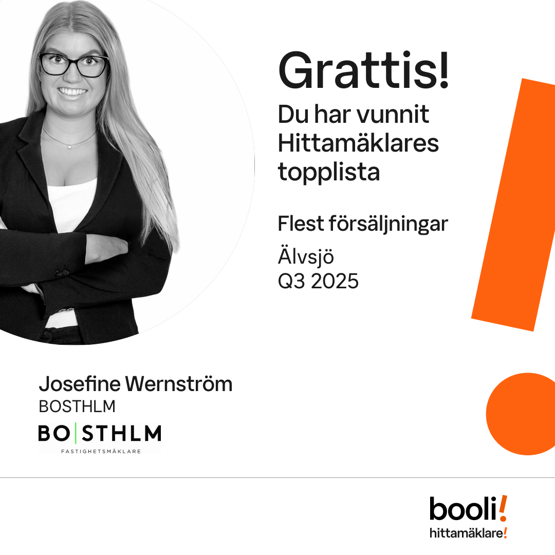 Statistik för publicerade bostäder, försäljningar och omdömen baseras på data från Booli och Hittamäklare. Statistiken för försäljningar avser inrapporterade och verifierade slutpriser från mäklare eller av Booli inhämtade och verifierade slutpriser. Statistiken för publicerade bostäder baseras på information som publicerats på Booli.se. Statistik för omdömen och rekommendationer baseras på omdömen från säljare som lämnats via Booli och Hittamäklare.