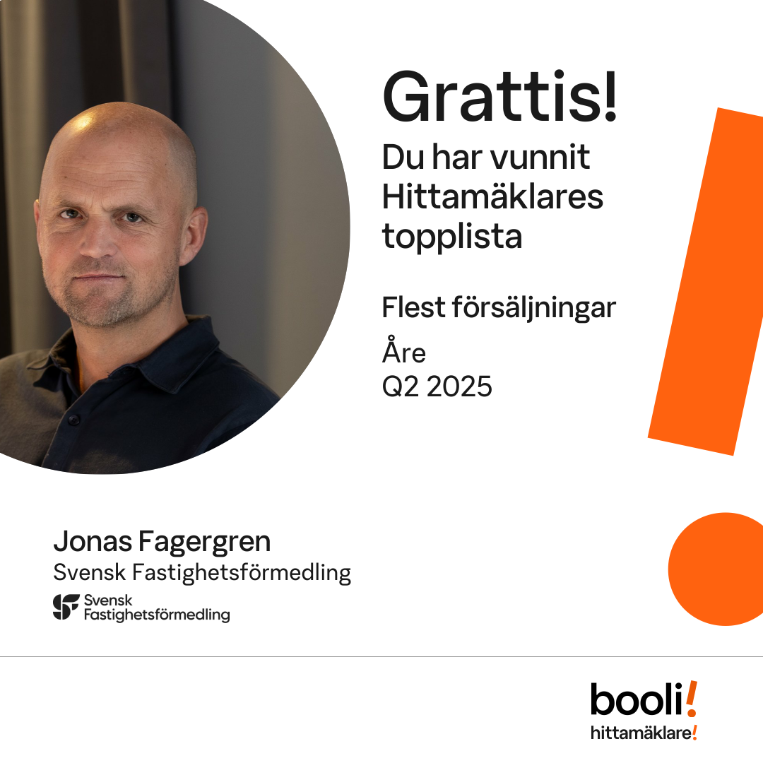 Statistik för publicerade bostäder, försäljningar och omdömen baseras på data från Booli och Hittamäklare. Statistiken för försäljningar avser inrapporterade och verifierade slutpriser från mäklare eller av Booli inhämtade och verifierade slutpriser. Statistiken för publicerade bostäder baseras på information som publicerats på Booli.se. Statistik för omdömen och rekommendationer baseras på omdömen från säljare som lämnats via Booli och Hittamäklare.