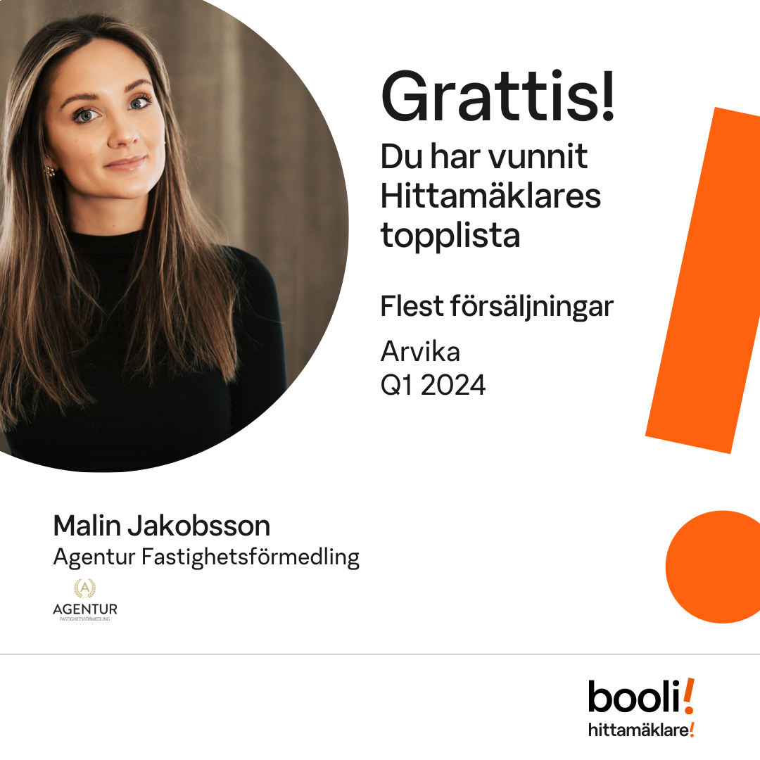Statistik för publicerade bostäder, försäljningar och omdömen baseras på data från Booli och Hittamäklare. Statistiken för försäljningar avser inrapporterade och verifierade slutpriser från mäklare eller av Booli inhämtade och verifierade slutpriser. Statistiken för publicerade bostäder baseras på information som publicerats på Booli.se. Statistik för omdömen och rekommendationer baseras på omdömen från säljare som lämnats via Booli och Hittamäklare.