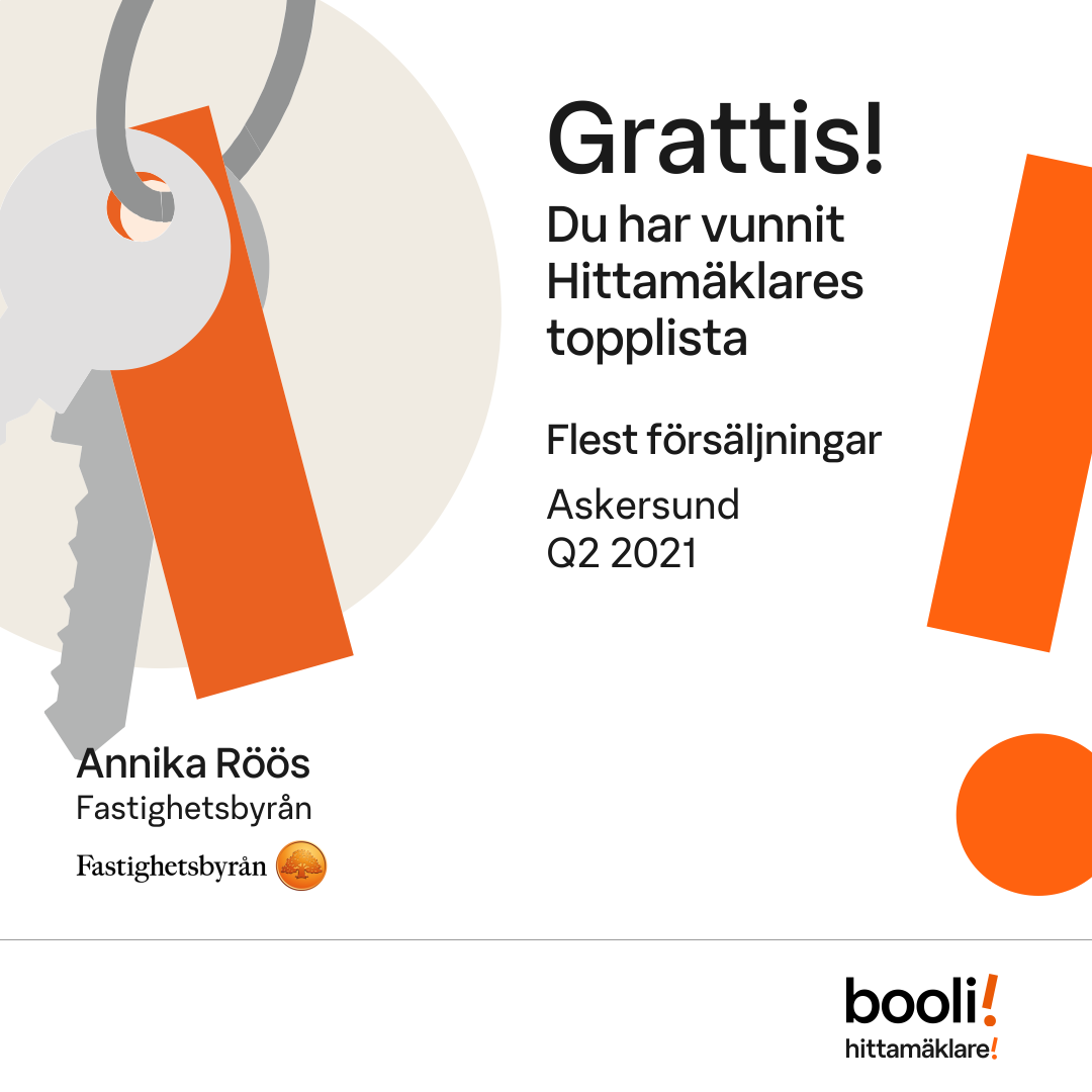 Statistik för publicerade bostäder, försäljningar och omdömen baseras på data från Booli och Hittamäklare. Statistiken för försäljningar avser inrapporterade och verifierade slutpriser från mäklare eller av Booli inhämtade och verifierade slutpriser. Statistiken för publicerade bostäder baseras på information som publicerats på Booli.se. Statistik för omdömen och rekommendationer baseras på omdömen från säljare som lämnats via Booli och Hittamäklare.