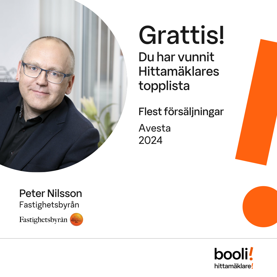 Statistik för publicerade bostäder, försäljningar och omdömen baseras på data från Booli och Hittamäklare. Statistiken för försäljningar avser inrapporterade och verifierade slutpriser från mäklare eller av Booli inhämtade och verifierade slutpriser. Statistiken för publicerade bostäder baseras på information som publicerats på Booli.se. Statistik för omdömen och rekommendationer baseras på omdömen från säljare som lämnats via Booli och Hittamäklare.