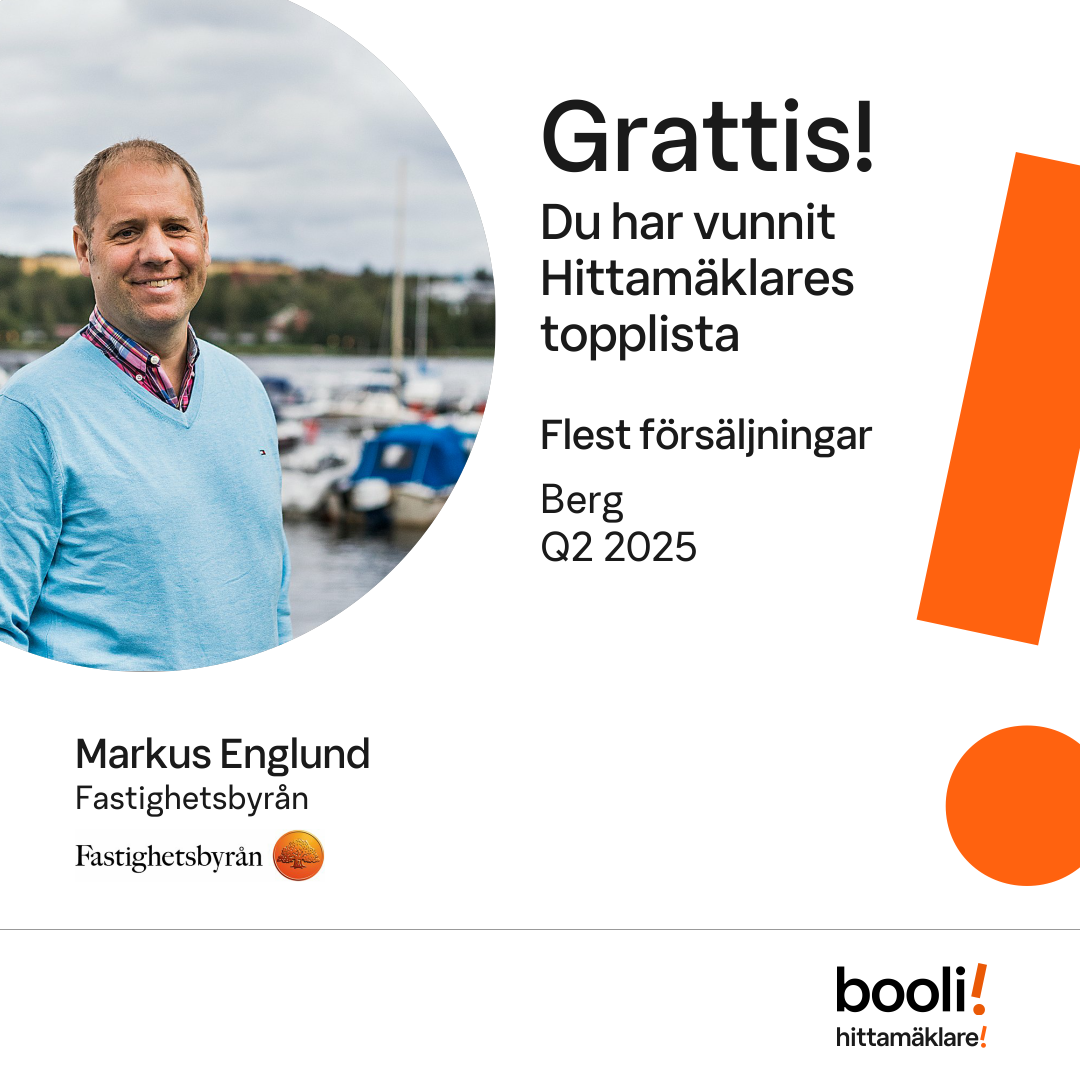 Statistik för publicerade bostäder, försäljningar och omdömen baseras på data från Booli och Hittamäklare. Statistiken för försäljningar avser inrapporterade och verifierade slutpriser från mäklare eller av Booli inhämtade och verifierade slutpriser. Statistiken för publicerade bostäder baseras på information som publicerats på Booli.se. Statistik för omdömen och rekommendationer baseras på omdömen från säljare som lämnats via Booli och Hittamäklare.