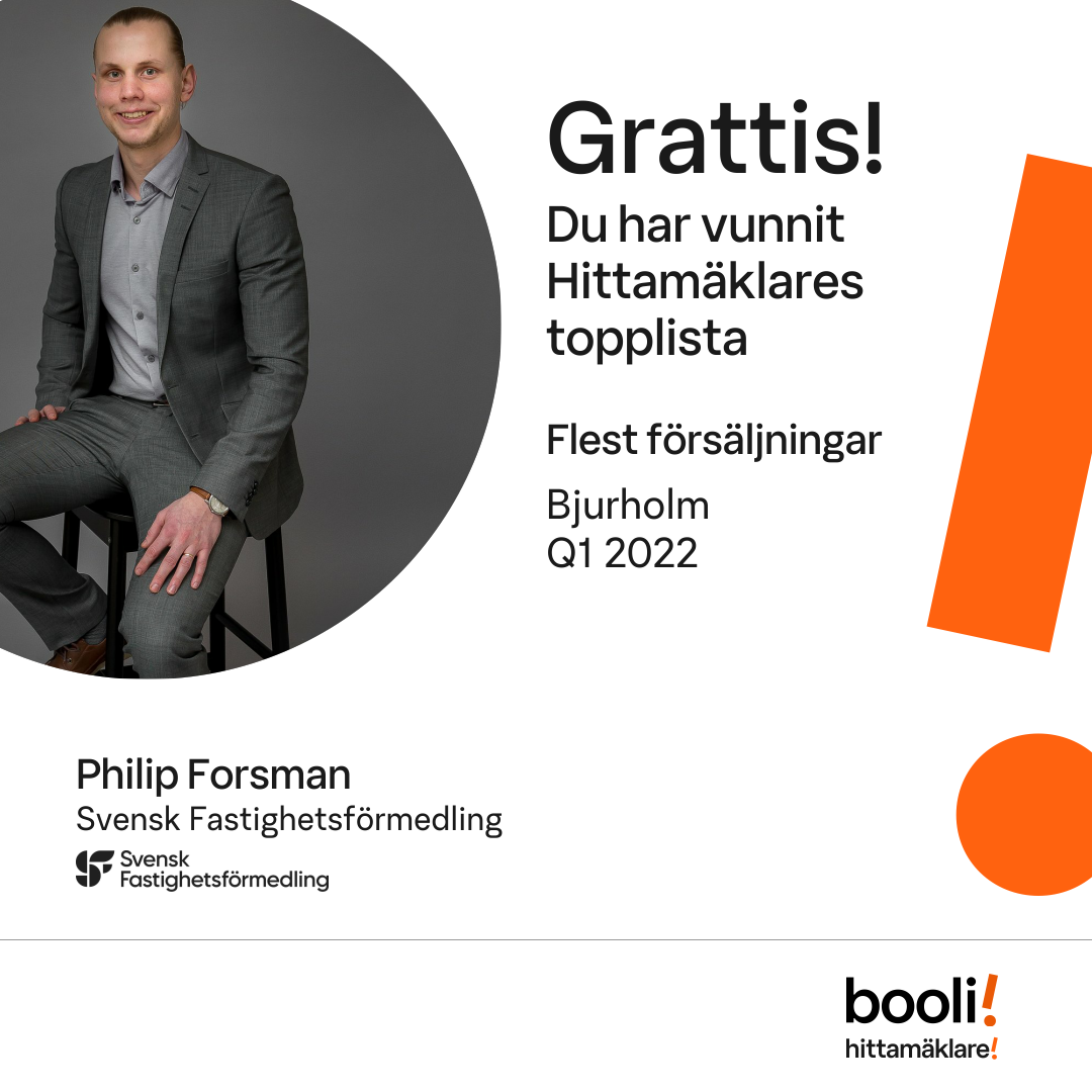 Statistik för publicerade bostäder, försäljningar och omdömen baseras på data från Booli och Hittamäklare. Statistiken för försäljningar avser inrapporterade och verifierade slutpriser från mäklare eller av Booli inhämtade och verifierade slutpriser. Statistiken för publicerade bostäder baseras på information som publicerats på Booli.se. Statistik för omdömen och rekommendationer baseras på omdömen från säljare som lämnats via Booli och Hittamäklare.